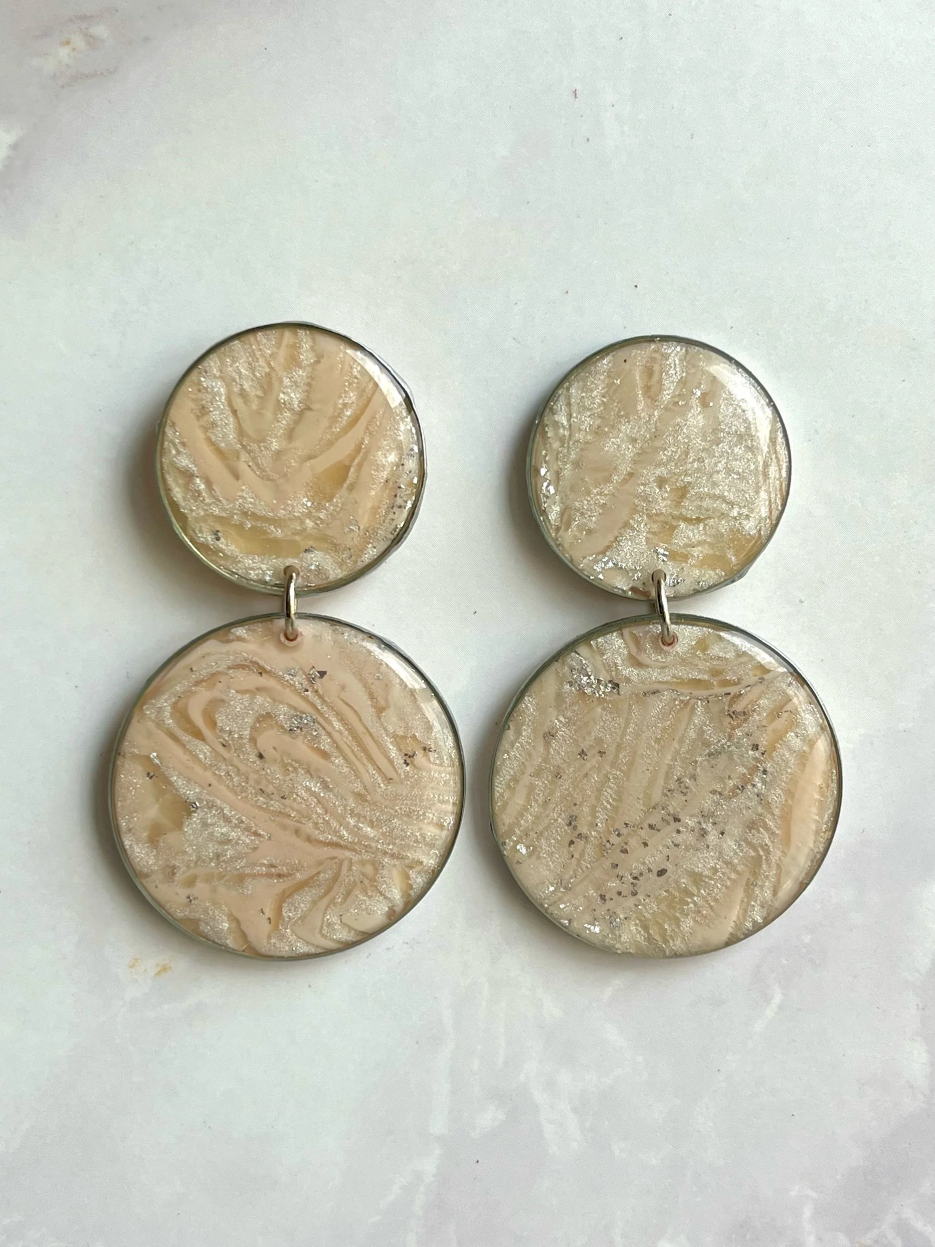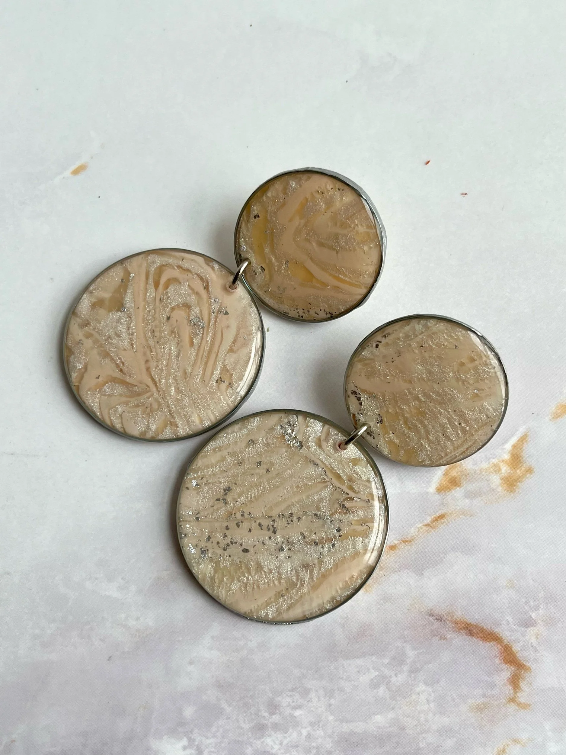 These polymer clay earrings are one of a kind and made by hand. Each pair are created with their own slight unique pattern to ensure that you are have the only one of its kind. They are just under 3.5 inches long, made with stainless steel earring post, are light on the ears and are the perfect addition to any outfit.
